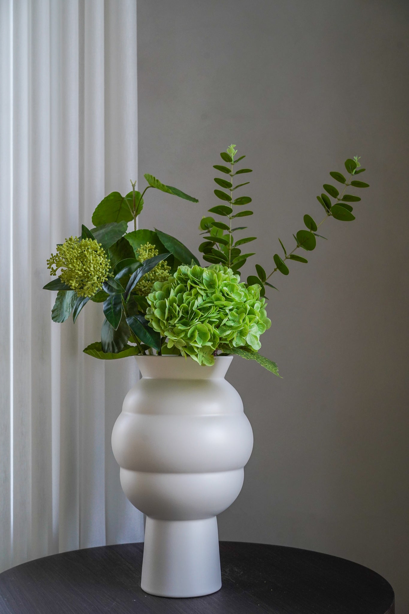 The lush green hydrangea bloom provides a full focal point surrounded by delicate lime-green clusters and structured foliage.Slender eucalyptus branches extend gracefully upward, adding height and natural movement to the arrangement.