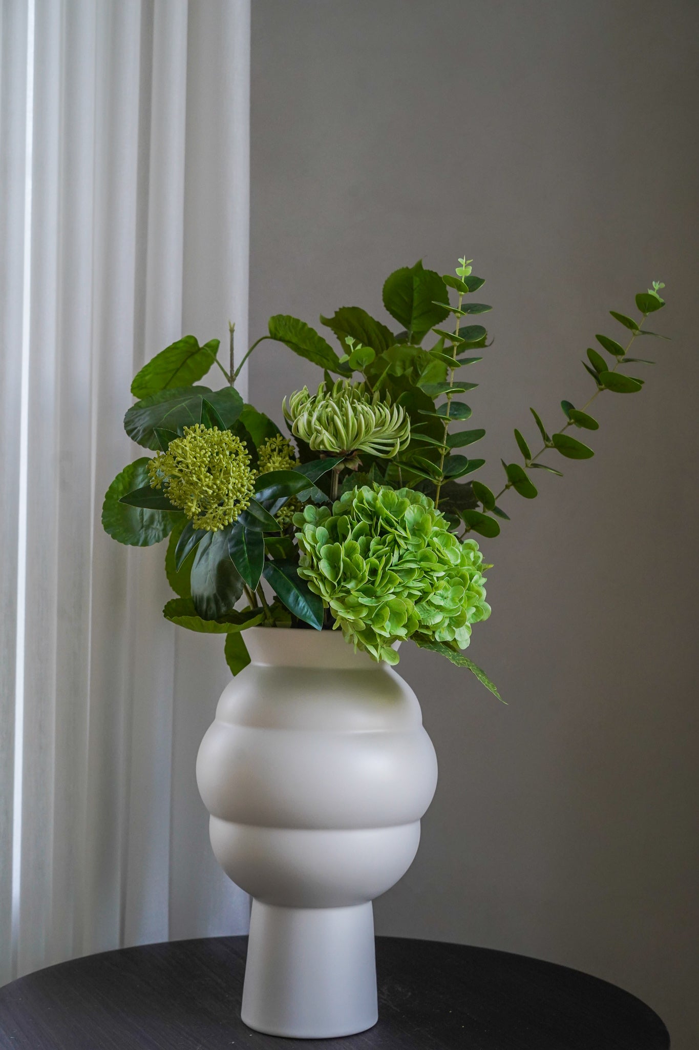 The lush green hydrangea bloom provides a full focal point surrounded by delicate lime-green clusters and structured foliage.Slender eucalyptus branches extend gracefully upward, adding height and natural movement to the arrangement.