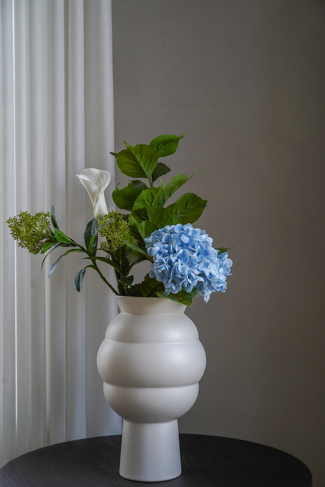 The statement blue hydrangea bloom provides a lush focal point with its hundreds of delicate petals in a serene sky-blue shade.A pristine white calla lily adds elegant contrast with its sculptural form and smooth texture against the clustered hydrangea.