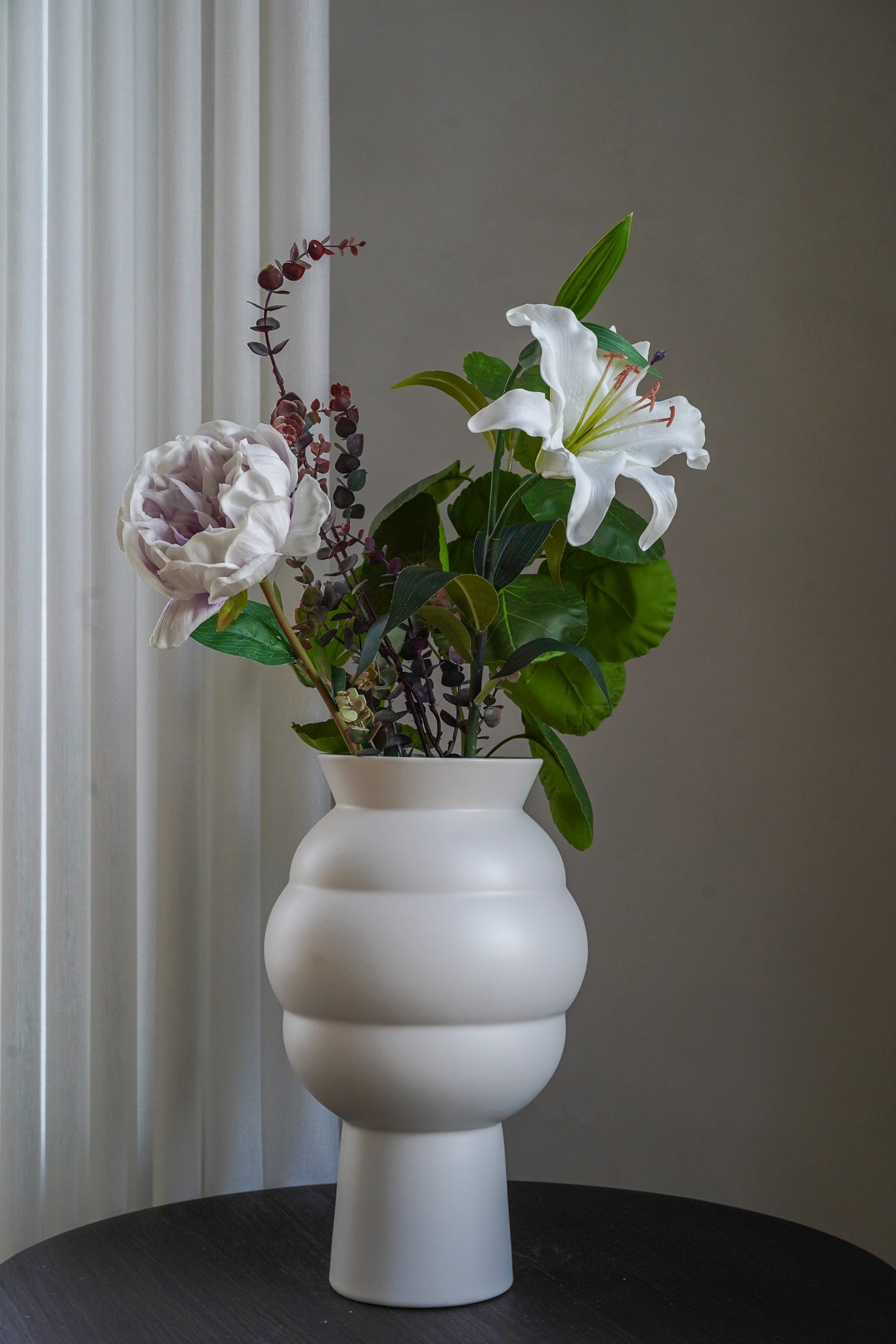 This sophisticated arrangement stands approximately 39 inches tall at its highest point.All stems can be easily shaped and adjusted to achieve your preferred silhouette for any setting. The timeless color palette ensures versatility across various décor styles and seasons.This bouquet brings understated luxury to contemporary interiors and special occasions.